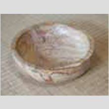 材料は岐阜の木材市場で購入されます。ケヤキとトチが主流ですが、柄や木目の面白い木を探されますから、樹種にはこだわられません。乾燥させるため、この材料を5年間工房で保管され、注文に応じて制作されます。制作過程も表を仕上げたら、ソリが出るため最低1日以上は工程を止められるというこだわり。「木によって仕上がりの良し悪しが違うけど、削り方による形やデザインで見せることはしたくない。木の最高のモノを見せる様に作っている。だから値段は木の価値で決めているんです」とポリシーを語られます。菓子鉢とお盆のセットを100とか大きな仕事が入ったり、4~6という家族分の注文もあったりする様ですが…。