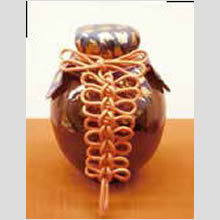 写真の藤の飾り結びをした茶壺。これは、石州流の茶人であった井伊直弼が残した茶壺飾りひな形9種の一つで、田中さんが彦根城博物館の図録写真を見て復元されました。