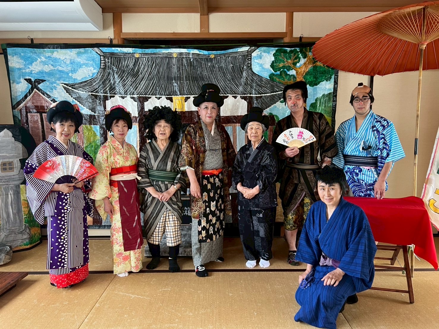 彦根を盛り上げ隊~小江戸実感劇団~と言うだけあって、彦根城でのパフォーマンスの他に30分程度の演劇もされます。演目はその時の気分や、ウケる流行りものを選ばれます。鳥居本の宿場祭り、近江鉄道のガチャフェス、彦根市内のイベントや地域の敬老会へ出演。花見、ゴールデンウィーク、秋のイベント時期には毎週末、休みなしの盛況です。ですから彦根城で彦根を盛り上げ隊に出会えたら「ラッキー!!!」なんですよ。高齢のため真夏と真冬はさすがに完全オフですが…。「ゴスロリやアニメのコスプレ好きは多いのですが、和風時代劇のコスプレは人気がないのか、私より若い人は参加してもらえないんです」と野瀬さん。衣装は昔の晴れ着や結婚衣装を使ったり、あるモノを工夫したり自分で作ったり。カツラも帽子に布を縫い付けて…。「個人持ちの個人管理だから、出来るだけ簡単に着れたり、かぶれたりするモノにして、しかもメンテナンスが楽なモノにしてます」と笑われます。